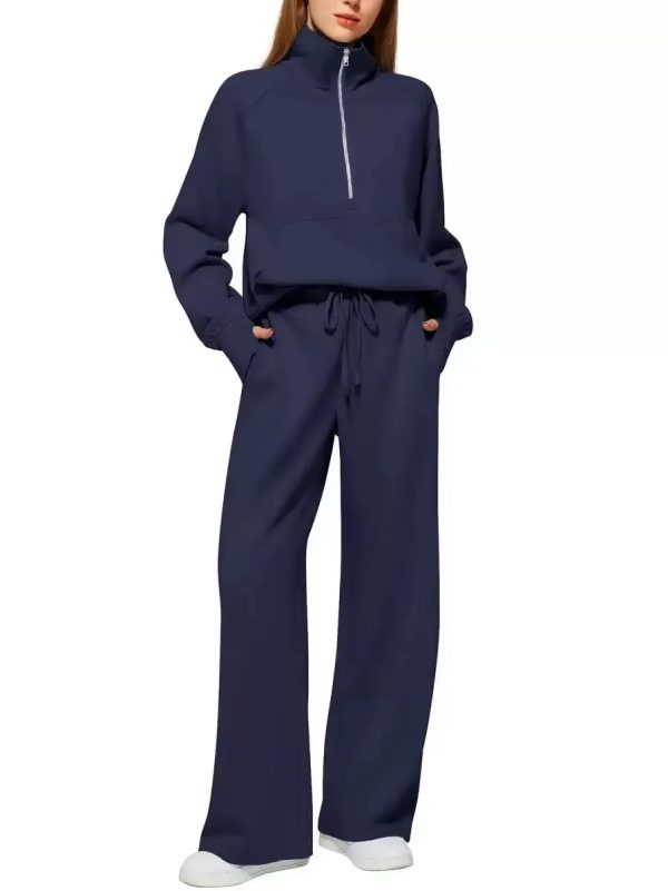 Женский спортивный костюм в стиле спорт-шик, который подарит тепло и комфорт во время прохладных летних, весенних, осенних прогулок. В комплект входят брюки широкого кроя и джемпер на молнии.